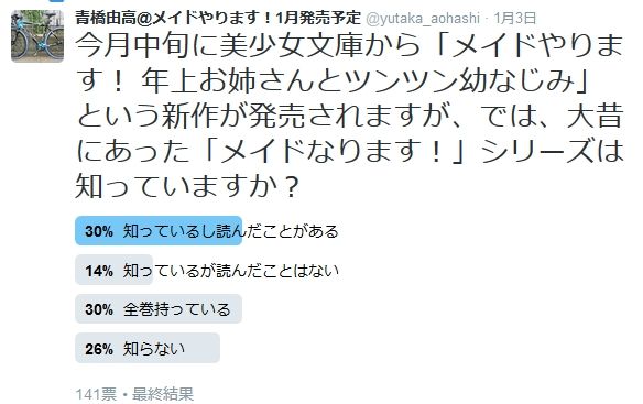 発売が近づいてきた「メイドやります! 年上お姉さんとツンツン幼なじみ」に合わせて、Twitterで「メイドなります!」シリーズを知ってますか、というアンケートをやってみました。
